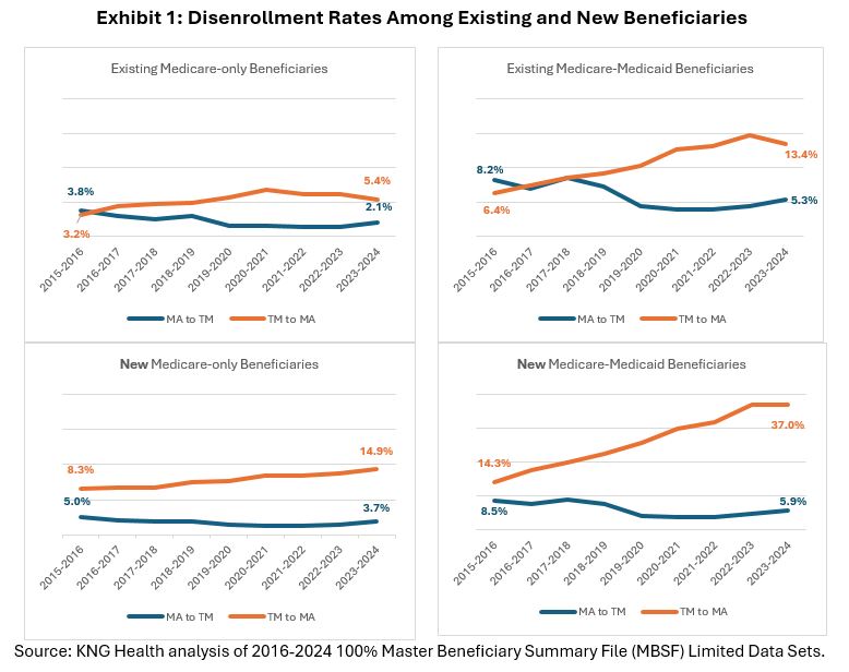 As the popularity of Medicare Advantage (MA) plans increased, so did the disenrollment from Traditional Medicare (TM). In previous work, we found that increasing rates of disenrollment from TM accounted for two-thirds (67%) of the growth in the share of MA enrollment between 2019 and 2020. In this blog, we update previously reported disenrollment trends through 2020 with more recent data (2021-2024) and assess rates by different population groups. We separately report findings for Medicare-only beneficiaries and Medicare-Medicaid beneficiaries (dual eligibles), as well as for new Medicare beneficiaries and those who are in the last year of life.