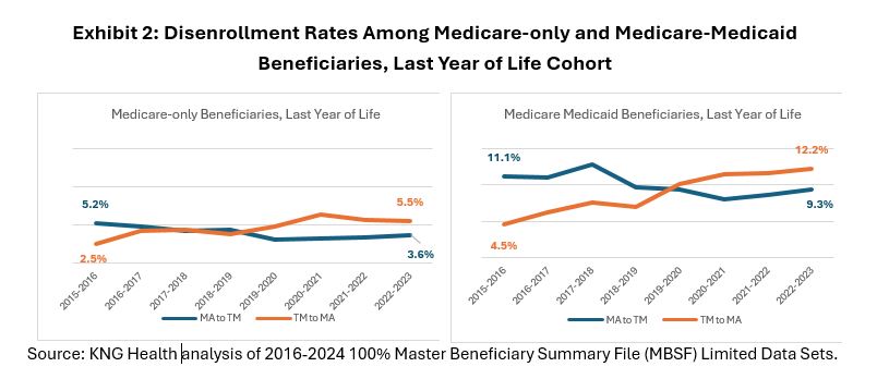 The differential between TM and MA disenrollment rates is smaller for beneficiaries in their last year of life. Since 2020, disenrollment from TM exceeded that from MA for end-of-life beneficiaries but started to converge in 2022 for Medicare-only beneficiaries as rates of switching fell for beneficiaries in their last year of life (from 6.5% in 2021 to 5.5% in 2023) (Exhibit 2).