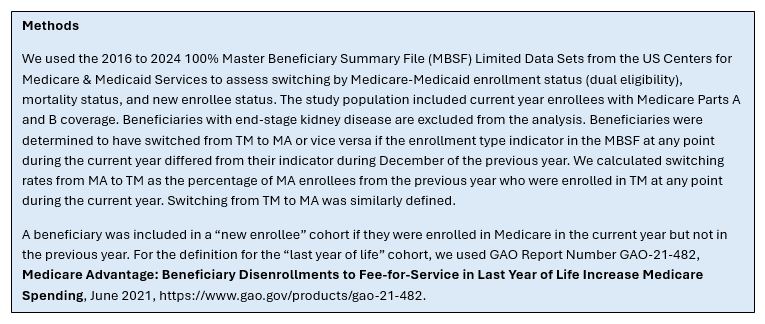 • MA to TM switching in the last year of life is higher than for the general Medicare population. This could suggest that end-of-life care needs may drive higher rates of disenrollment from MA, possibly reflecting greater provider choice and fewer utilization management controls in TM. Low-income and medically complex populations (e.g., duals) may be especially sensitive to perceived or real limitations in MA near the end of life.
