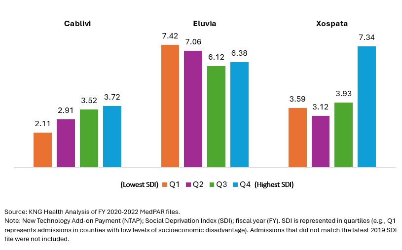 In this blog, we assess the extent to which the adoption of NTAP-designated drugs is similar across communities of varying social deprivation. We report, by a hospital’s SDI, Medicare beneficiaries’ utilization of three NTAP-designated drugs: (1) CABLIVI® – a medication that treats a life-threatening blood disorder; (2) EluviaTM – a drug eluting stent used to treat peripheral arterial disease; and (3) XOSPATA® – a medication used to treat acute myeloid leukemia (AML). These drugs were selected, in part, due to their high prices: the maximum NTAP for these drugs (which represents 65% of their wholesale acquisition costs) ranged from $3,647 (EluviaTM) to $33,215 (CABLIVI®). We identified each drug in inpatient fee-for-service Medicare claims based on assigned MS-DRG and ICD-10-PCS procedure codes. To calculate procedure-specific NTAP utilization rates, we identified inpatient admissions with these procedures and divided that number by the admissions potentially eligible to receive that treatment based on the drug’s therapeutic indication and diagnoses on a claim.
